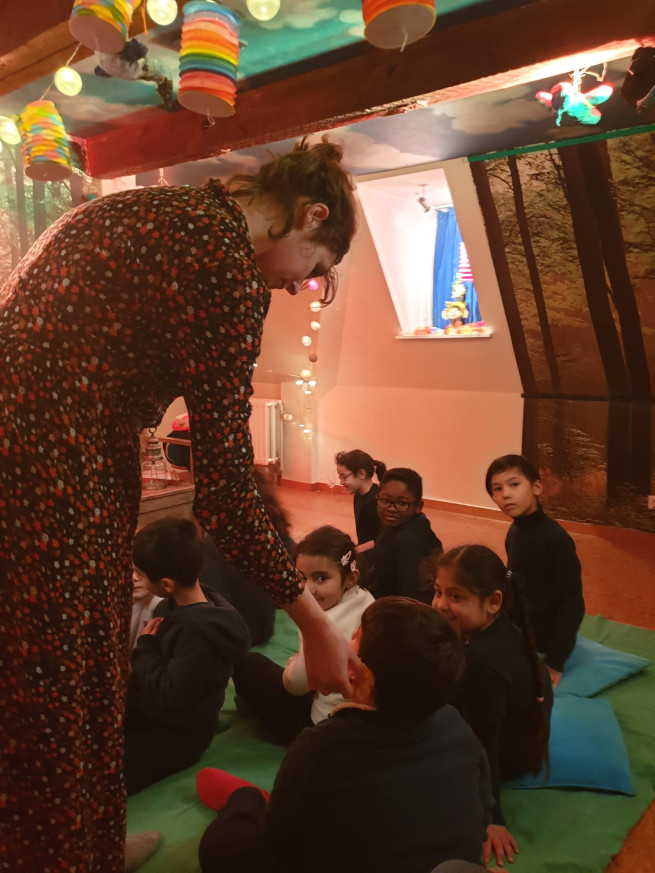 wo 11/01/2023 - 14:16 Na een flinke wandeling naar het Rivierenhof luisterde L1 naar de magische verhalen in het Sprookjeshuis. Lagere school L1